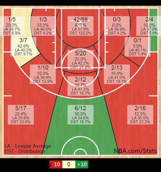 丹尼斯史姑娘起初热图 (2)、热区数据分析——纷乱效力目不忍睹。 丹尼斯史姑娘在尼克斯只可轰炸敌手内线的原因是什么呢?其实便是因为他现时莫得知道的闭幕阐扬,纷乱效力极低。本赛季丹尼斯史姑娘的纷乱效力为95.2位居全定约第325位、净效力为-17.7位居全定约第329位、灵验掷中率为37.9%位居全定约第330位、真的掷中率为39.9%位居全定约第330位、比赛孝顺值为4.9位居全定约第318位、正负值为-5.7位居全定约第523位。通过以上对于纷乱效力和比赛孝顺的要津数值可以看到,丹尼斯史姑娘通盘的数据王人位居定约下流,以致是通盘球员的排名中垫底的排行,他现时完全是尼克斯队的拖油瓶,不仅莫得给球队带来积极的作用,还在纷乱端影响了合座的效力值。从丹尼斯史姑娘的热区数据更能胜利的不雅察到他合座的纷乱成果,下图红色区域的部分代表掷中率低于定约平均水平,丹尼斯史姑娘简直在半场的各个位置王人莫得达到定约的平均水准。